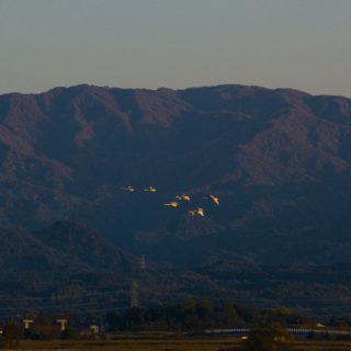 五頭山麓いこいの森から約12kmのところに福島潟があります。ちょうどこの時期になると、白鳥がやってきます。 白鳥は餌場へ行ったり来たりするので、朝と夕に見ることができます。