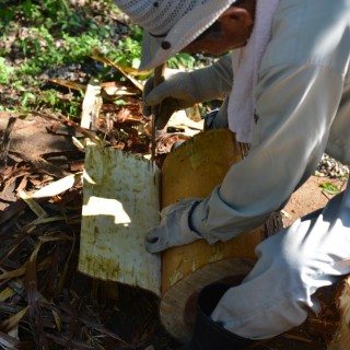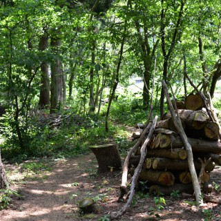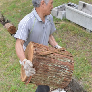 五頭山麓いこいの森の中を軽トラが走っています。 運んでます。ゆらゆら。 下ろします。よいしょ。 こちらは皮をはぎます。 これを、机やいすにしていきます。