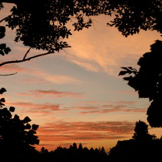 夕方になってもまだ暑いですね。 日が傾くと、木々の合間から夕日が見えます。