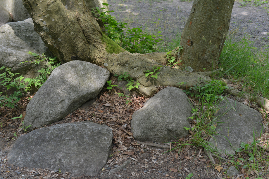 こちらは、木の下で踏みつけられているのか、それとも木が石と石の間を割って出てきたのか、はてはて。