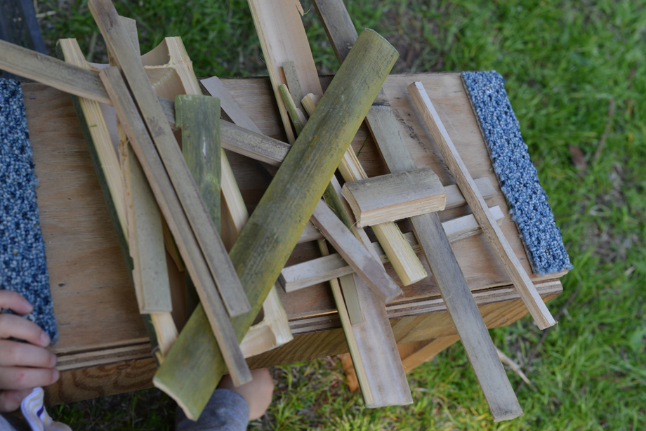 そうしたら、お兄ちゃんが刃物で食器を作っている間、少し飽きたらしく、真ん中の男の子が端材を積み上げ始めました。