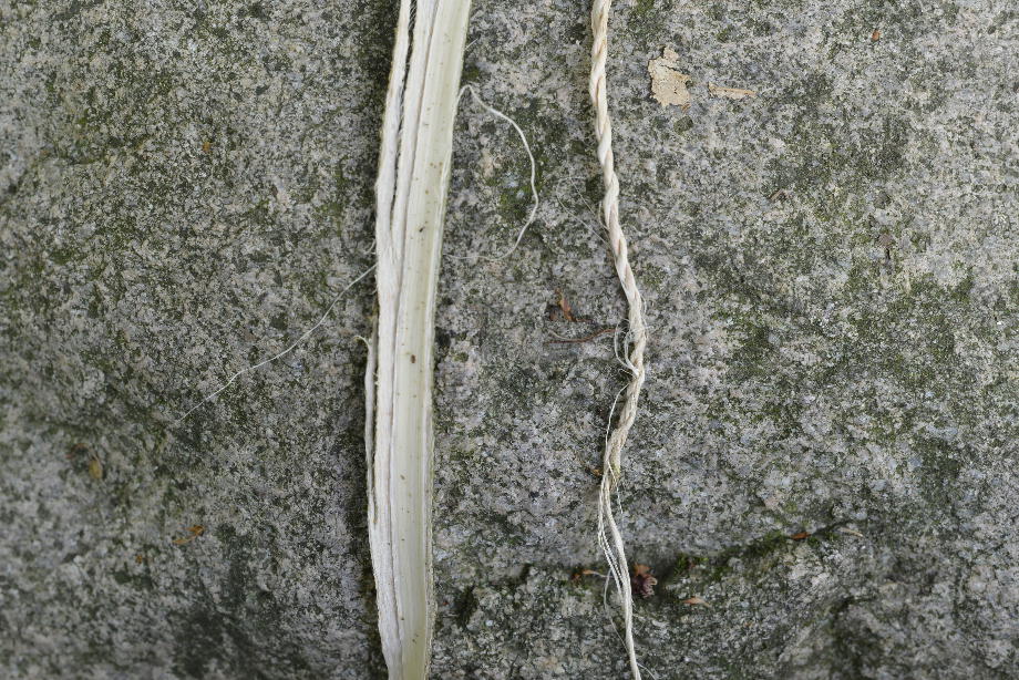 線維を真ん中で折り返して、右側の繊維を右にひねって、上から左へと交差します。今度は、さっきまでは左にいたけれど、右にやってきた繊維を右にひねって、上から左へと交差…の繰り返しです。