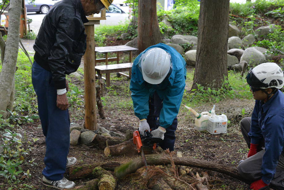 チェーンソーを使っていると、刃が切れなくなってきますので、やすりで研ぐ方法も習います。