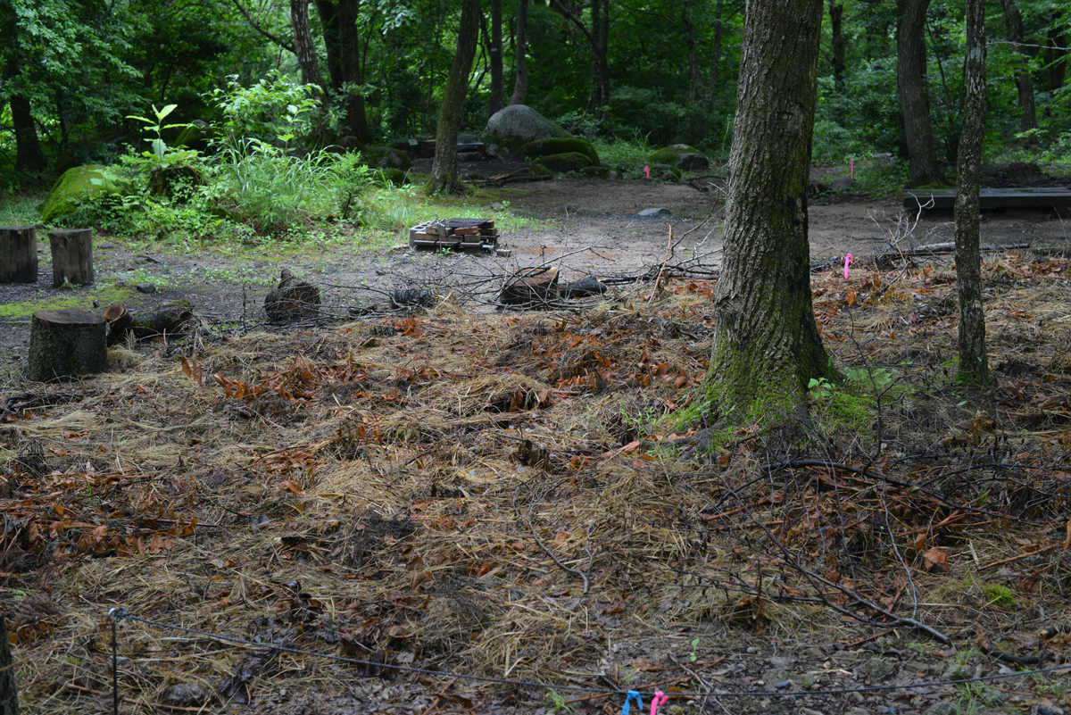 林冠が開けたところや低いところで水の通り道になっているところを中心に、表面の土壌が流れてしまうので、私たちが踏み固めないように養生しているところもあります。