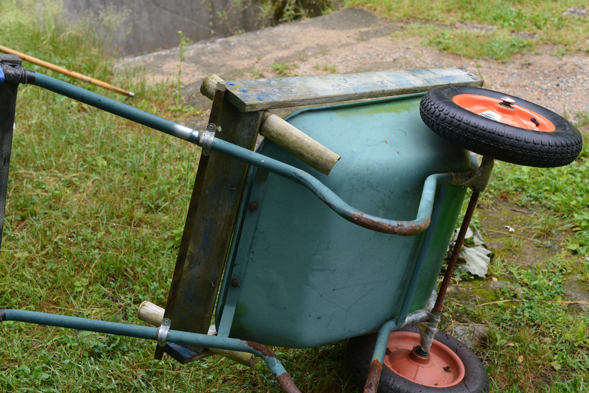 運搬量を増やして、仕事をしやすくするために一輪車の持ち手と荷台を改造しています。