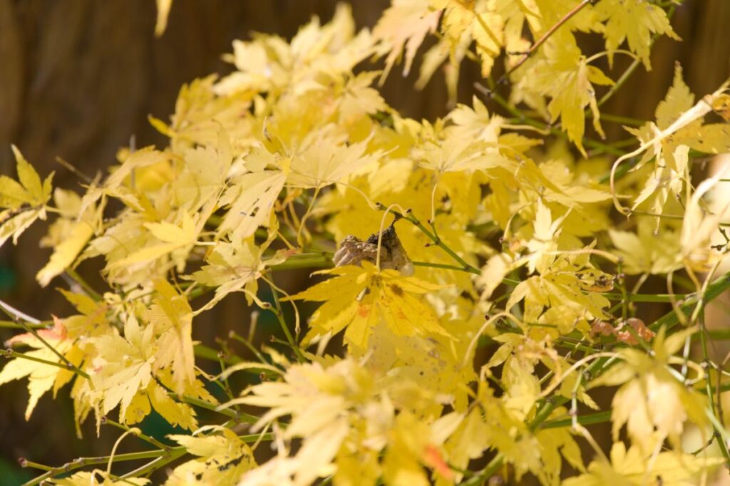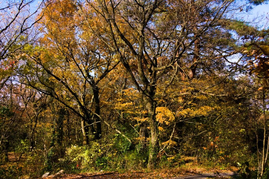 紅葉と言っても、真っ赤なモミジは少なく、黄色や茶色の葉が多いですね。また、緑色の低木も目立ちます。