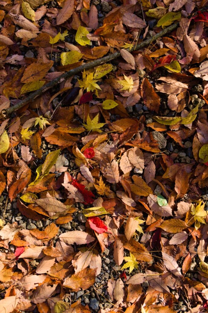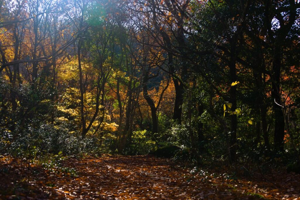 残る緑と輝く落ち葉